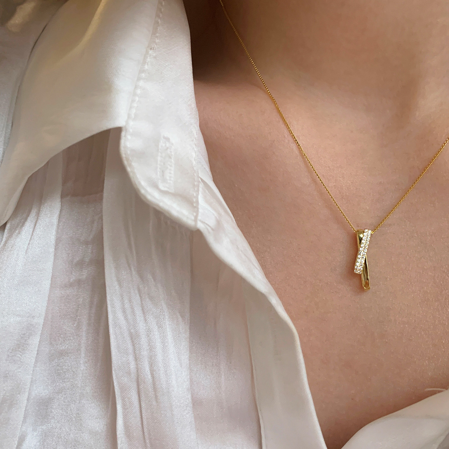 Detailed view of the gold 925 sterling silver cross necklace with cubic zirconia.