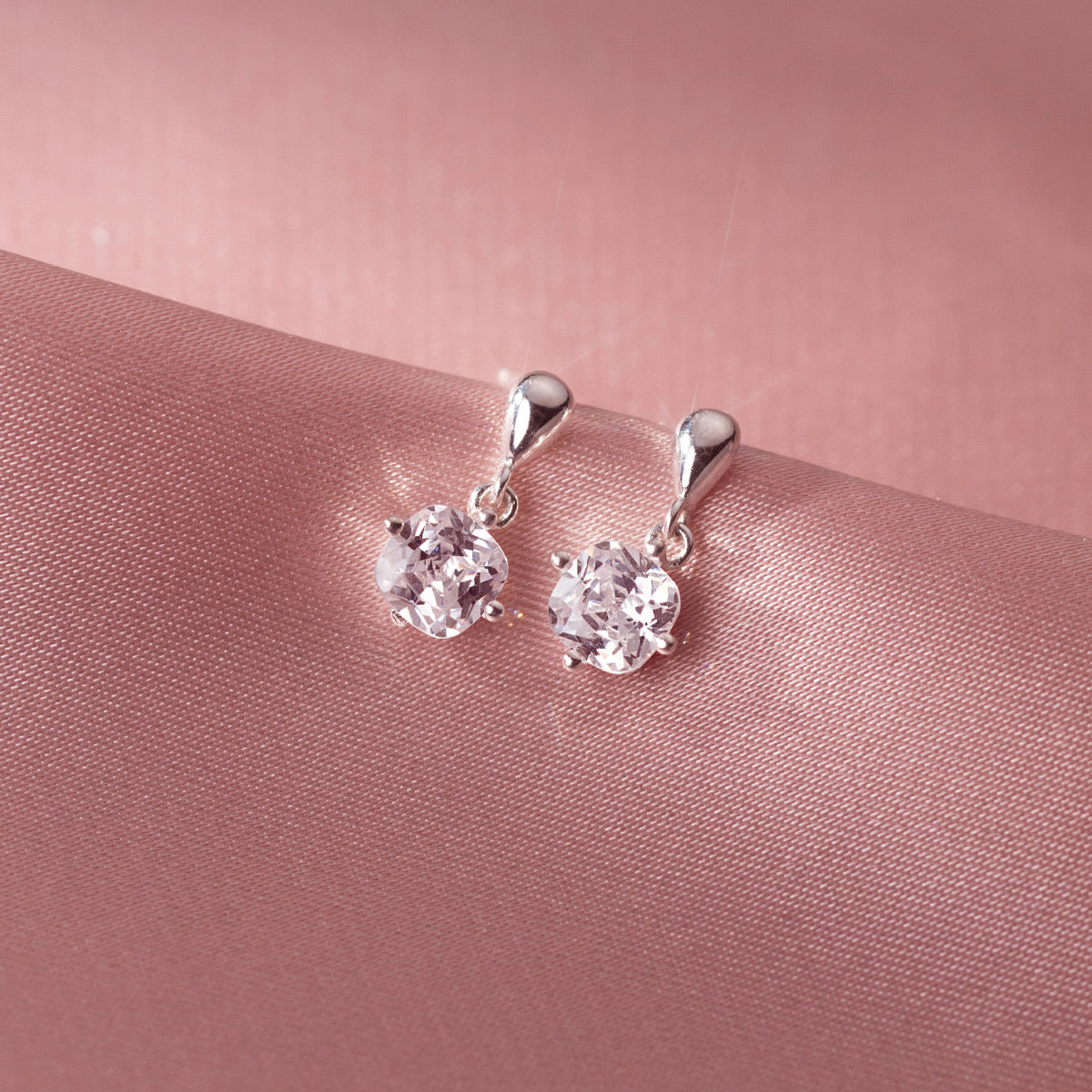 Elegant sterling silver drop earrings with cubic zirconia on a soft pink background.
