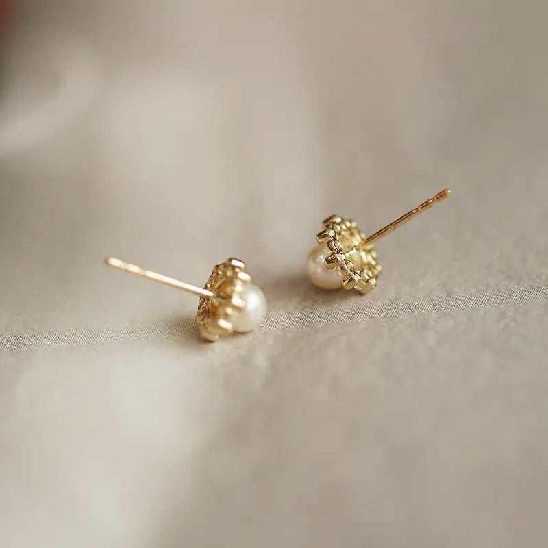 A pair of simple yet elegant gold pearl stud earrings from the set.