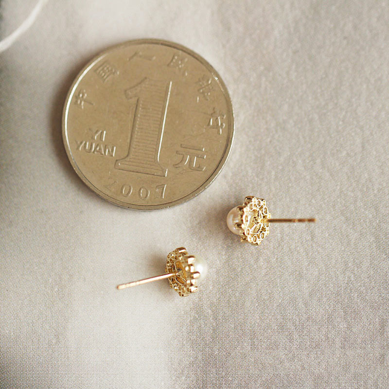 Size comparison of the gold pearl stud earrings next to a coin.