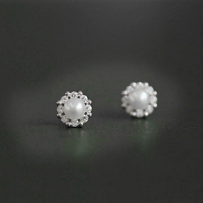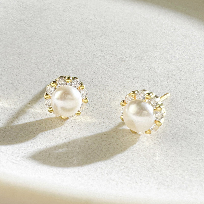 A classic and elegant pair of pearl earrings with a sparkling gemstone halo.