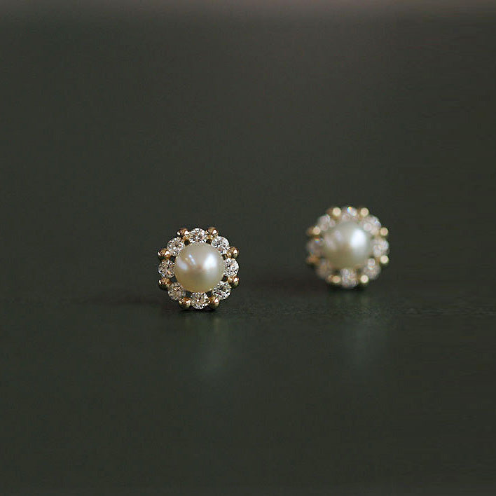 Close-up view of the pearl stud earrings with a brilliant gemstone halo.