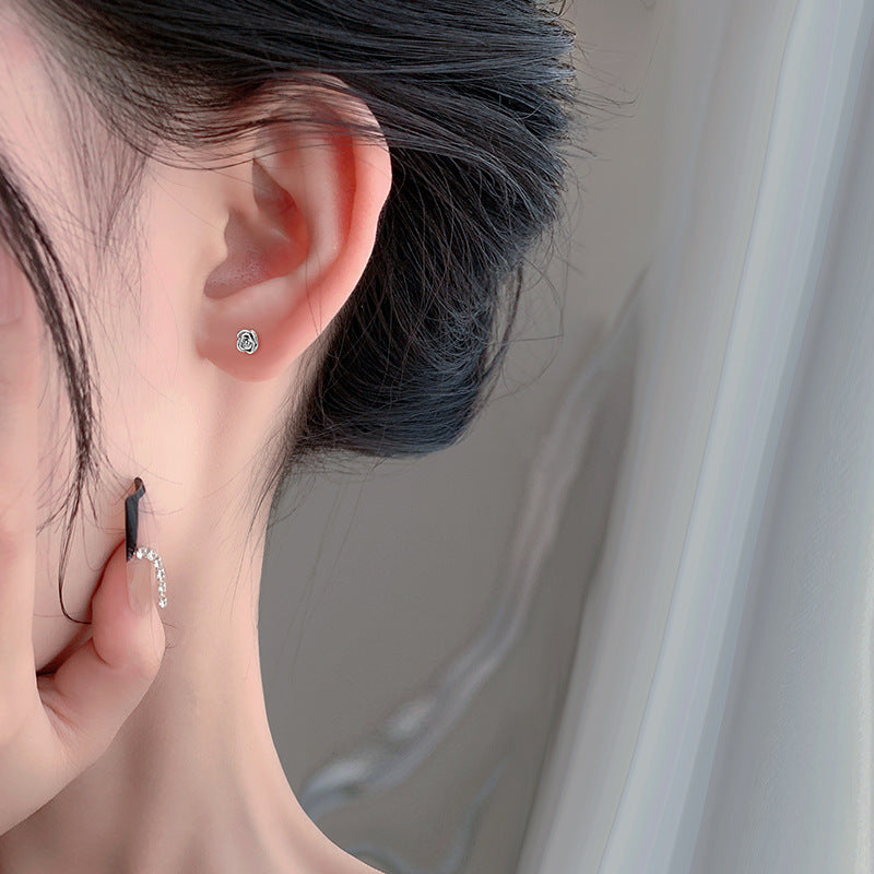 - Close-up of the S925 sterling silver flower rose stud earring.