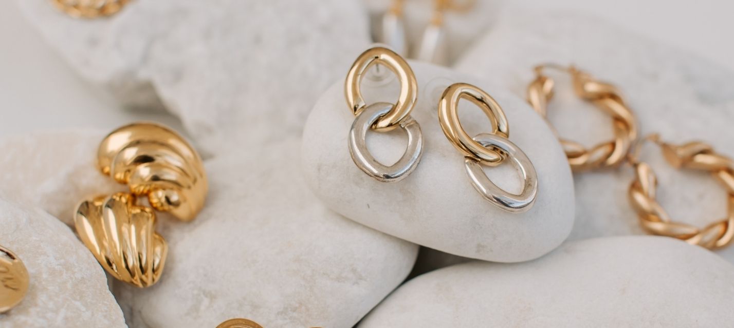 - A collection of gold and silver jewelry, highlighting interlocking ring earrings, representing our wholesale offerings.