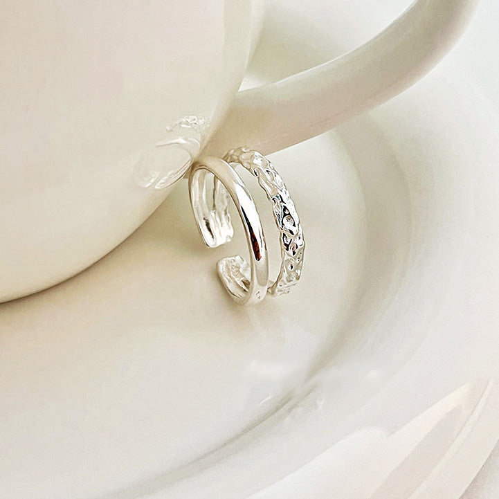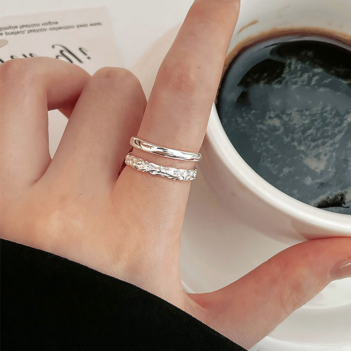 - A model's hand wearing the dual-layered two-texture silver rings while holding a coffee cup, showcasing their stylish appeal.