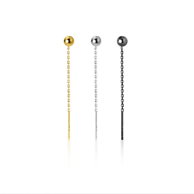 - Close-up of the 925 sterling silver ear thread earrings available in gold, silver, and black plating.
