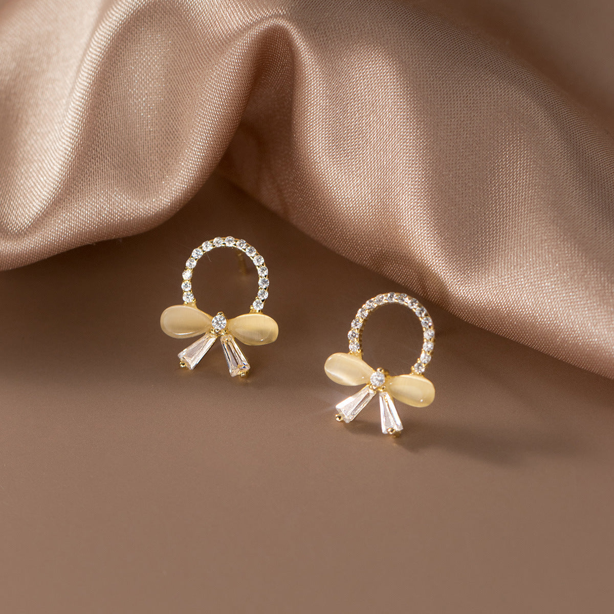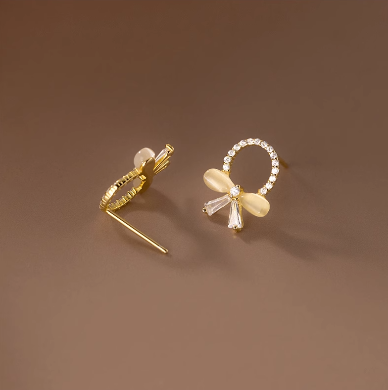 - Detailed view of the gold bow earrings showcasing the pale yellow and clear stone accents.