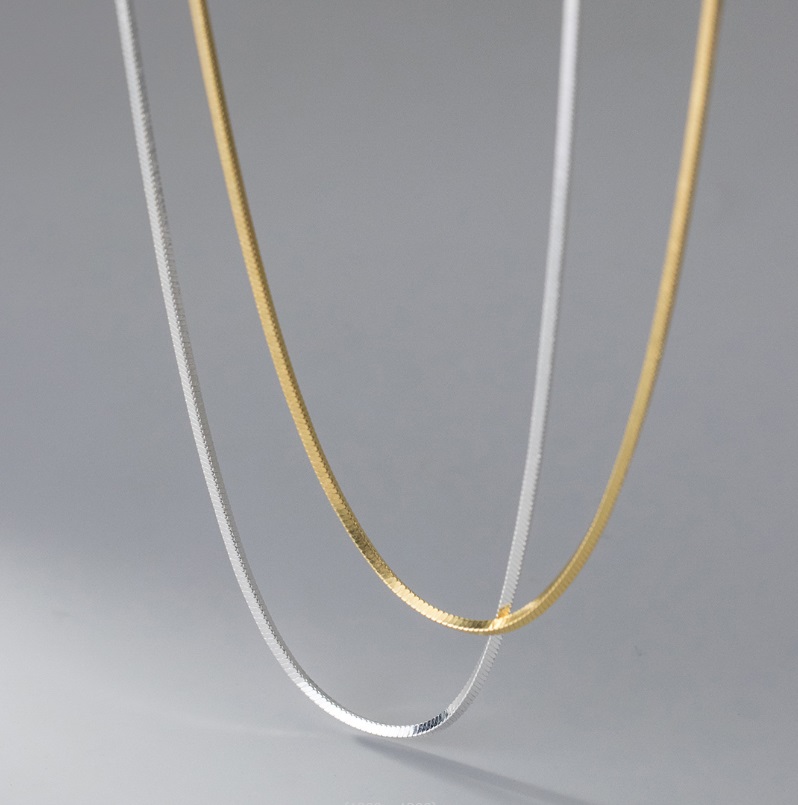 - Top-down view of the flat snake chain necklaces in both gold and silver, showing their sleek and modern design.