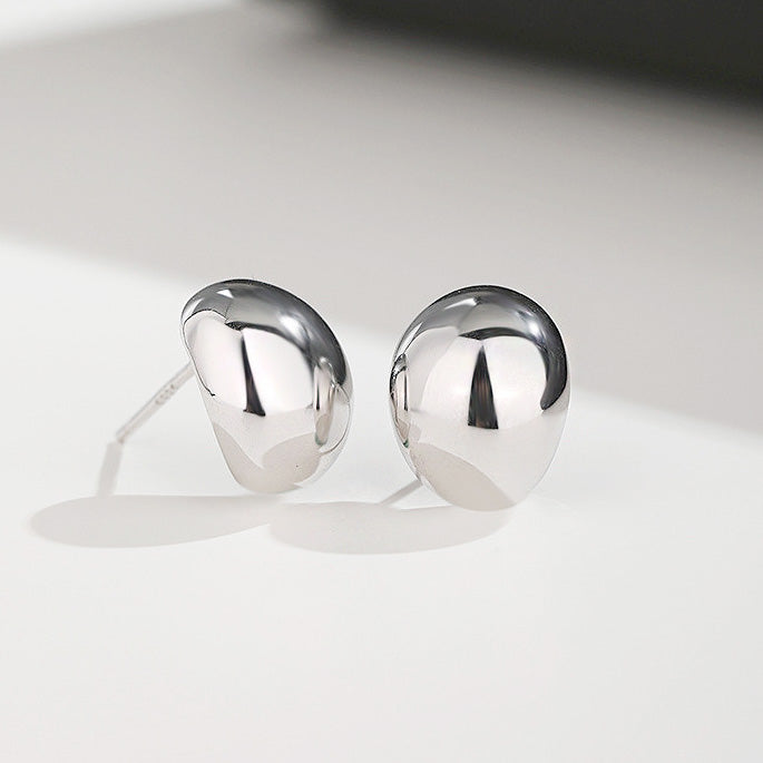 - A pair of polished 925 sterling silver small bean stud earrings on a neutral surface.