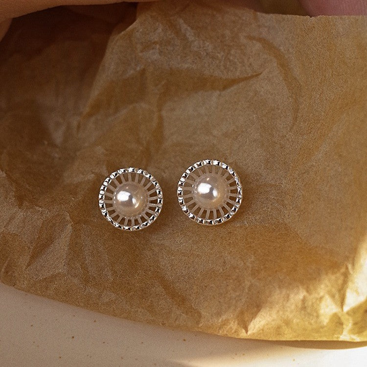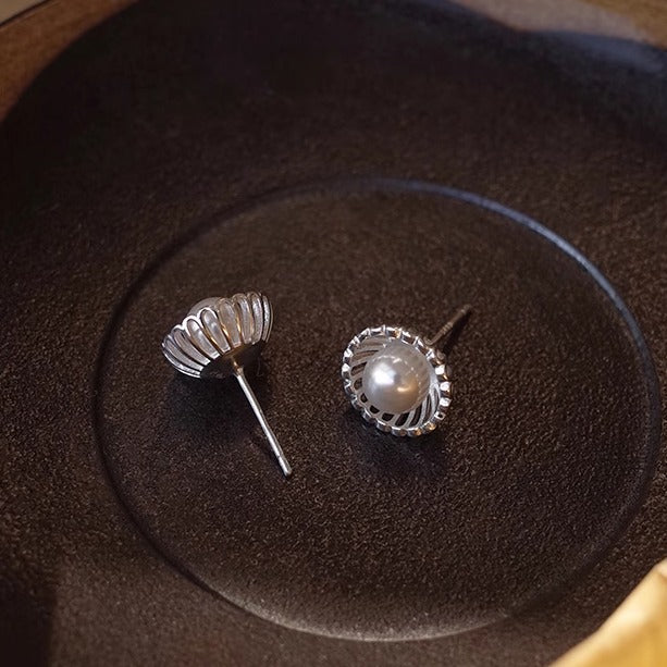 These French-inspired stud earrings combine intricate openwork detailing with the soft, captivating luster of shell pearls. The classic round silhouette features delicate, hollow metalwork that encircles a perfectly centered pearl, creating a look that is both romantic and refined.
