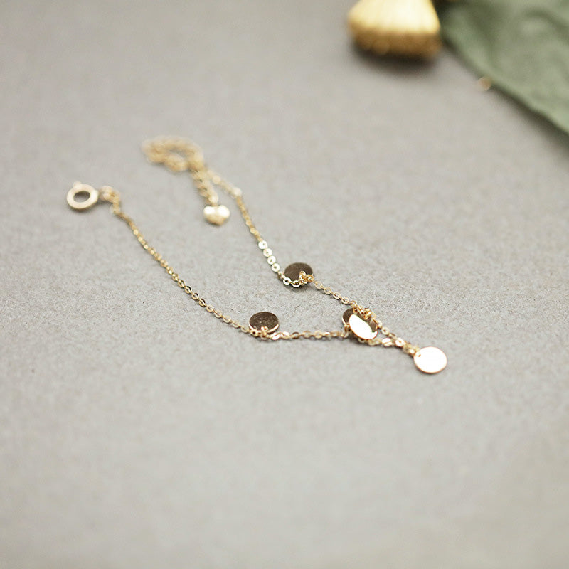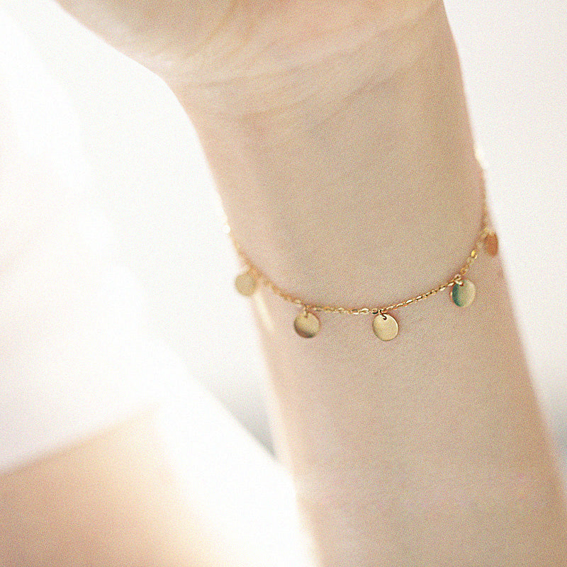 Detailed view of a gold-plated sterling silver bracelet with small disc charms.