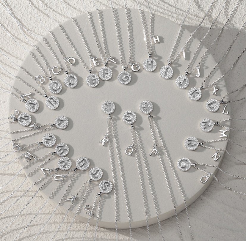 The complete alphabet set of the initial coin necklaces in sterling silver with cubic zirconia.