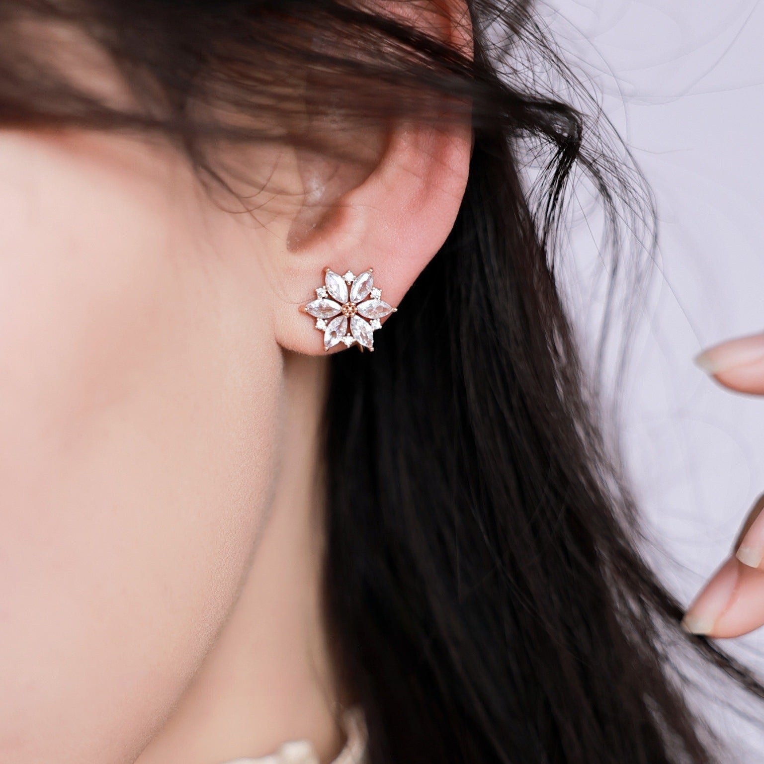 Close-up of a rose gold flower-shaped earring with sparkling cubic zirconia.