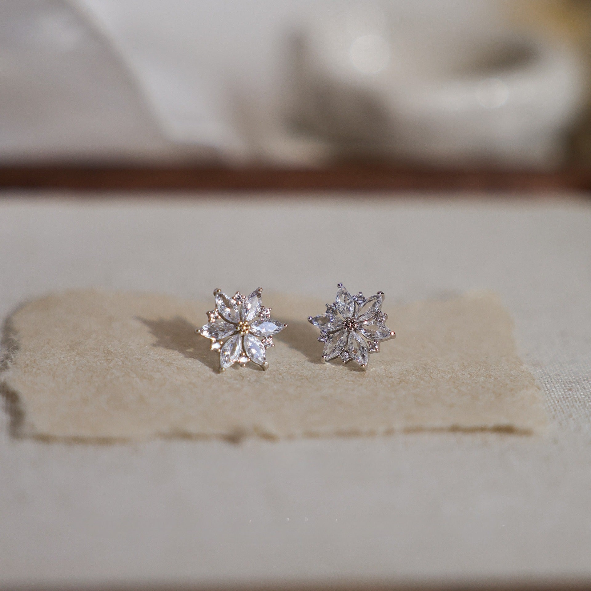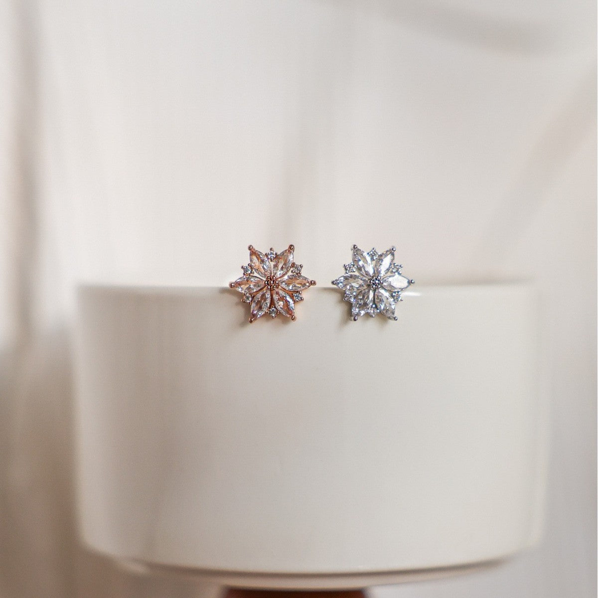 A pair of brilliant flower-shaped earrings showcasing their sparkling stones.