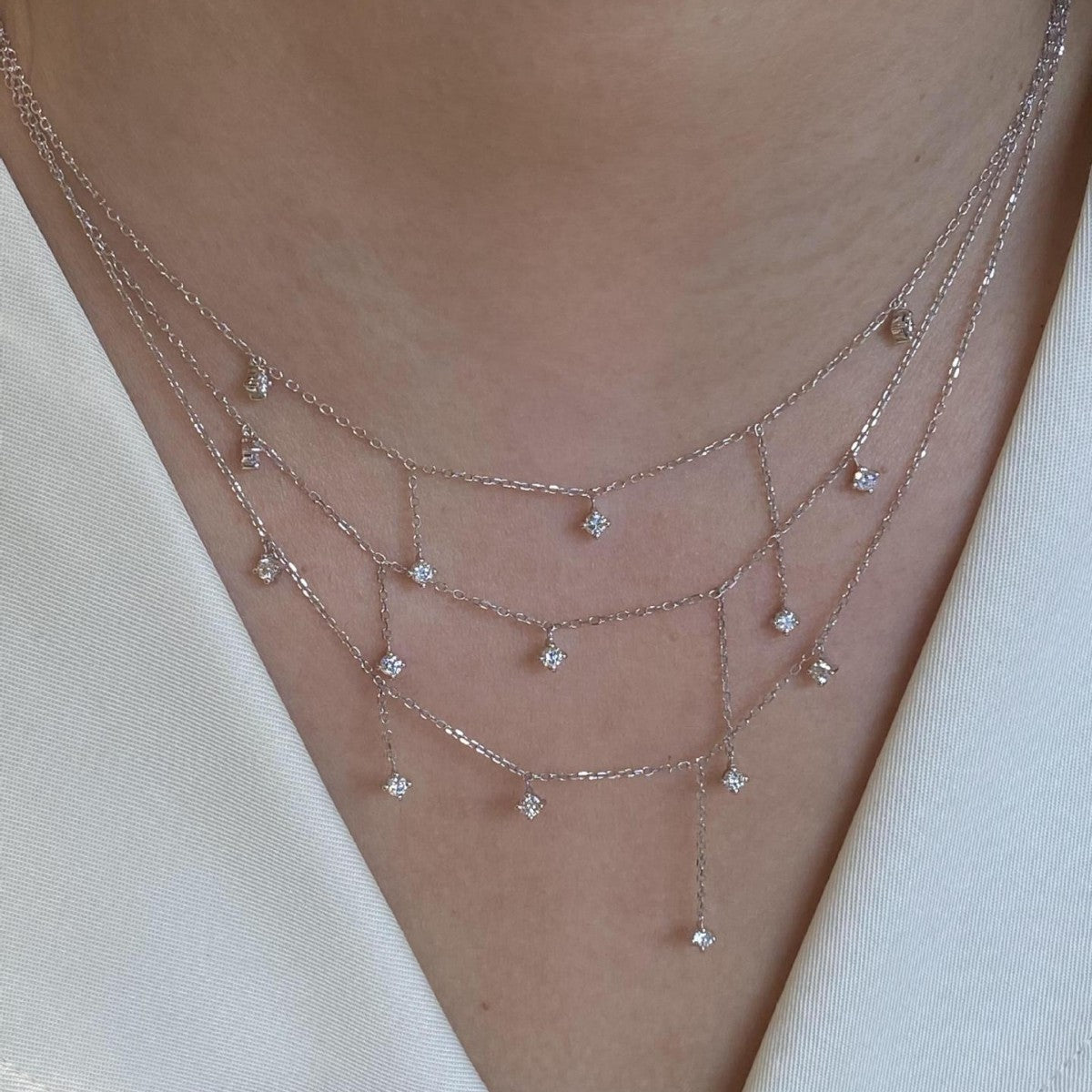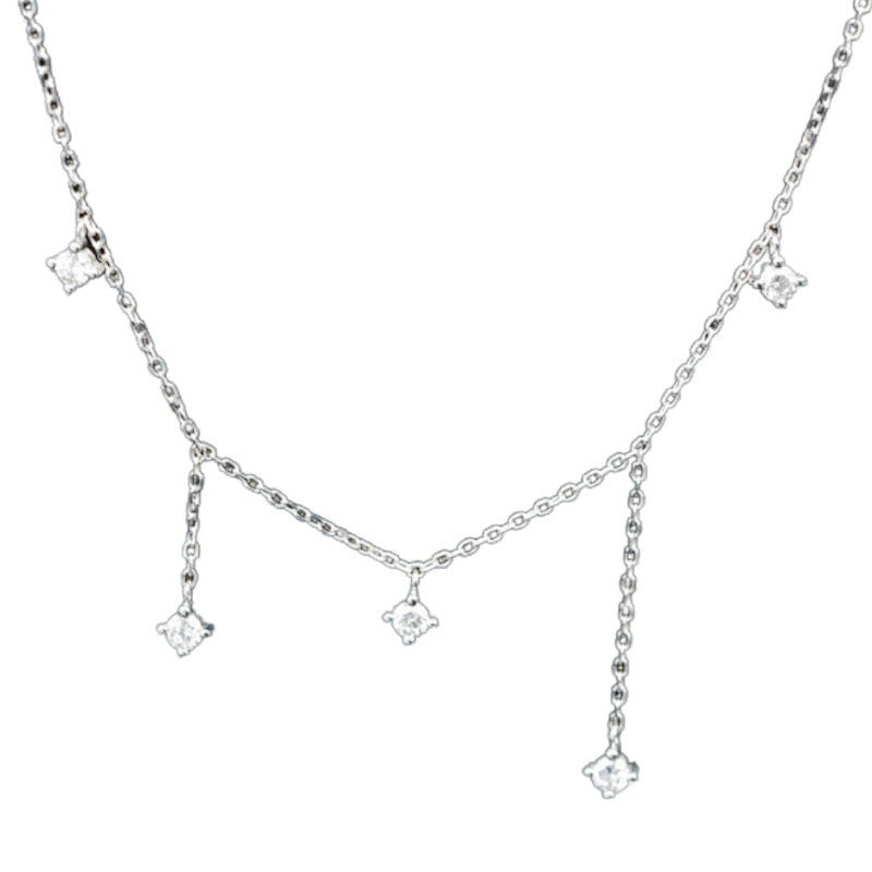 Close-up view of the delicate chain and clear gemstone details of the silver tassel necklace.