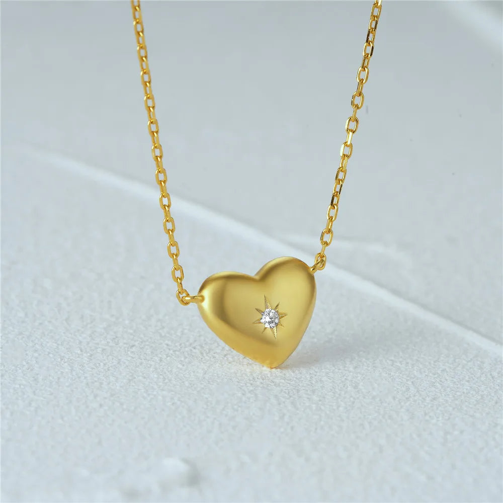 Close-up of the gold heart pendant necklace with a central zircon stone.