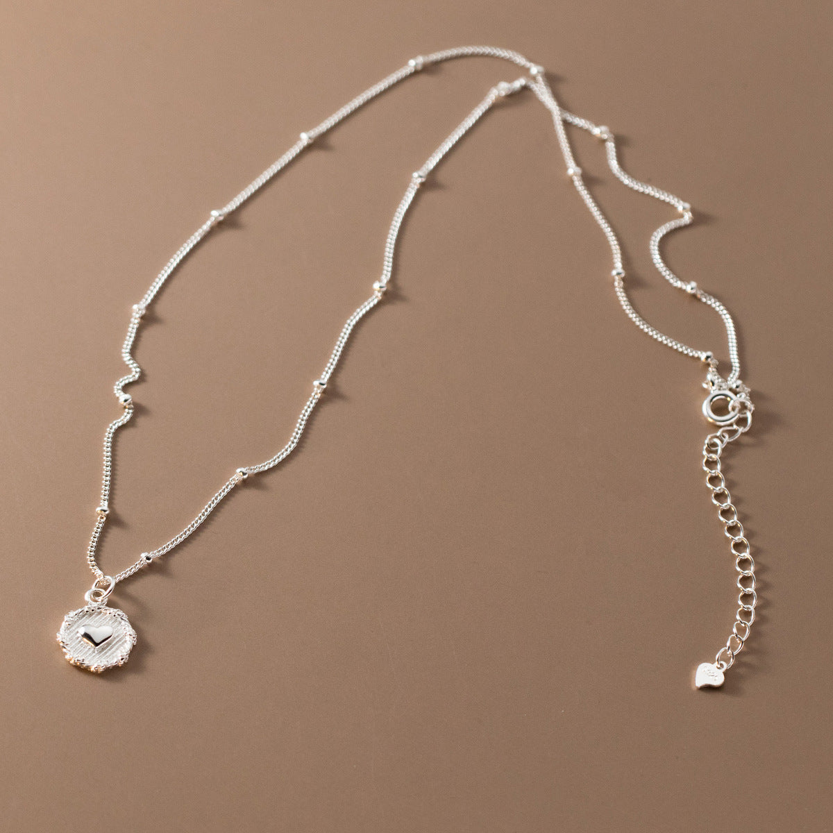 Another angle of the 925 sterling silver heart necklace, emphasizing the beaded chain design.