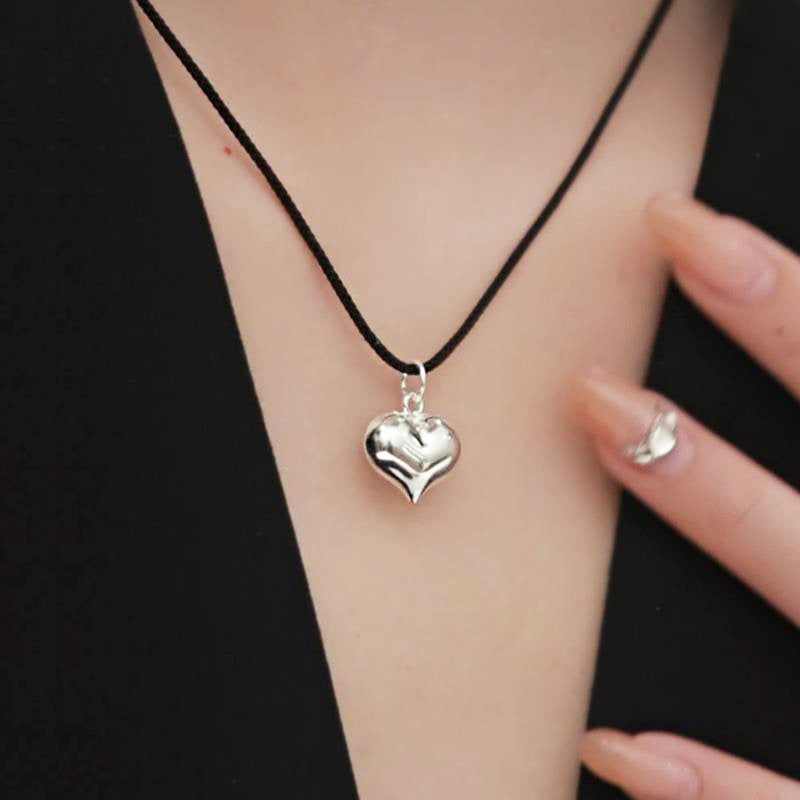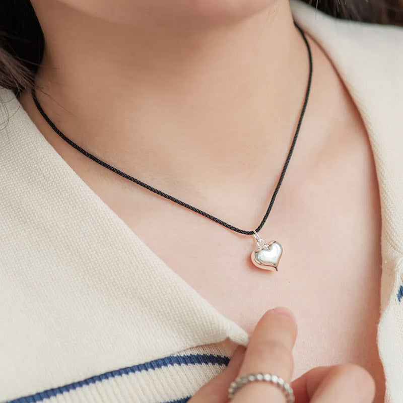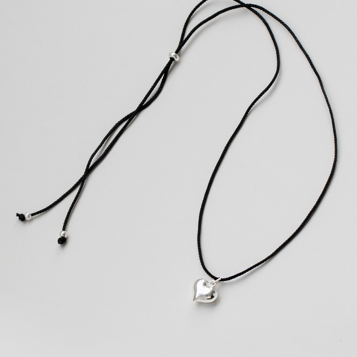 Full view of the black cord necklace with the silver heart pendant.