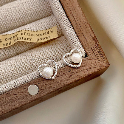 925 Sterling Silver Hollow Heart Pearl Stud Earrings (5 Pairs)