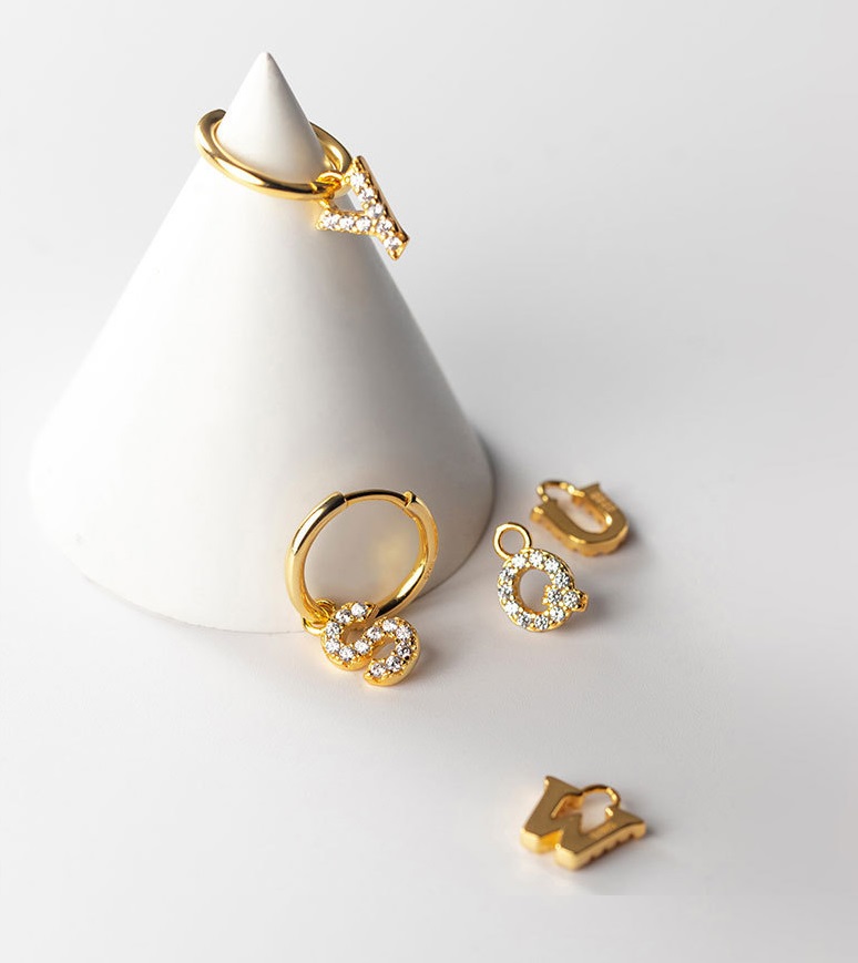 Close-up of gold alphabet letter charms for the initial hoop earrings, embellished with white stones.