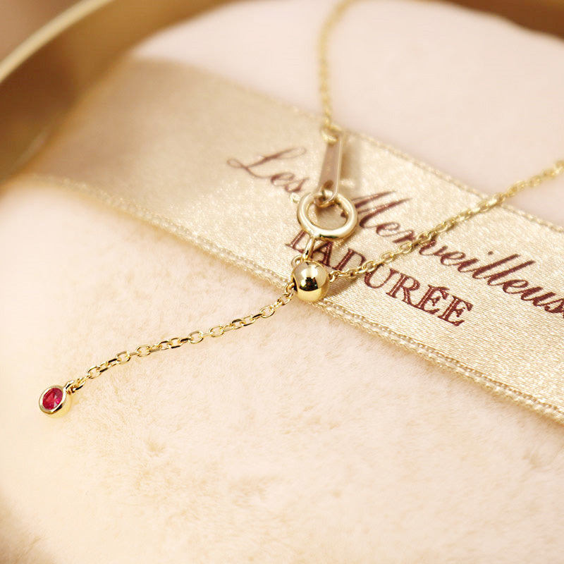 Close-up on a single red gemstone on the gold link chain, showing fine craftsmanship.