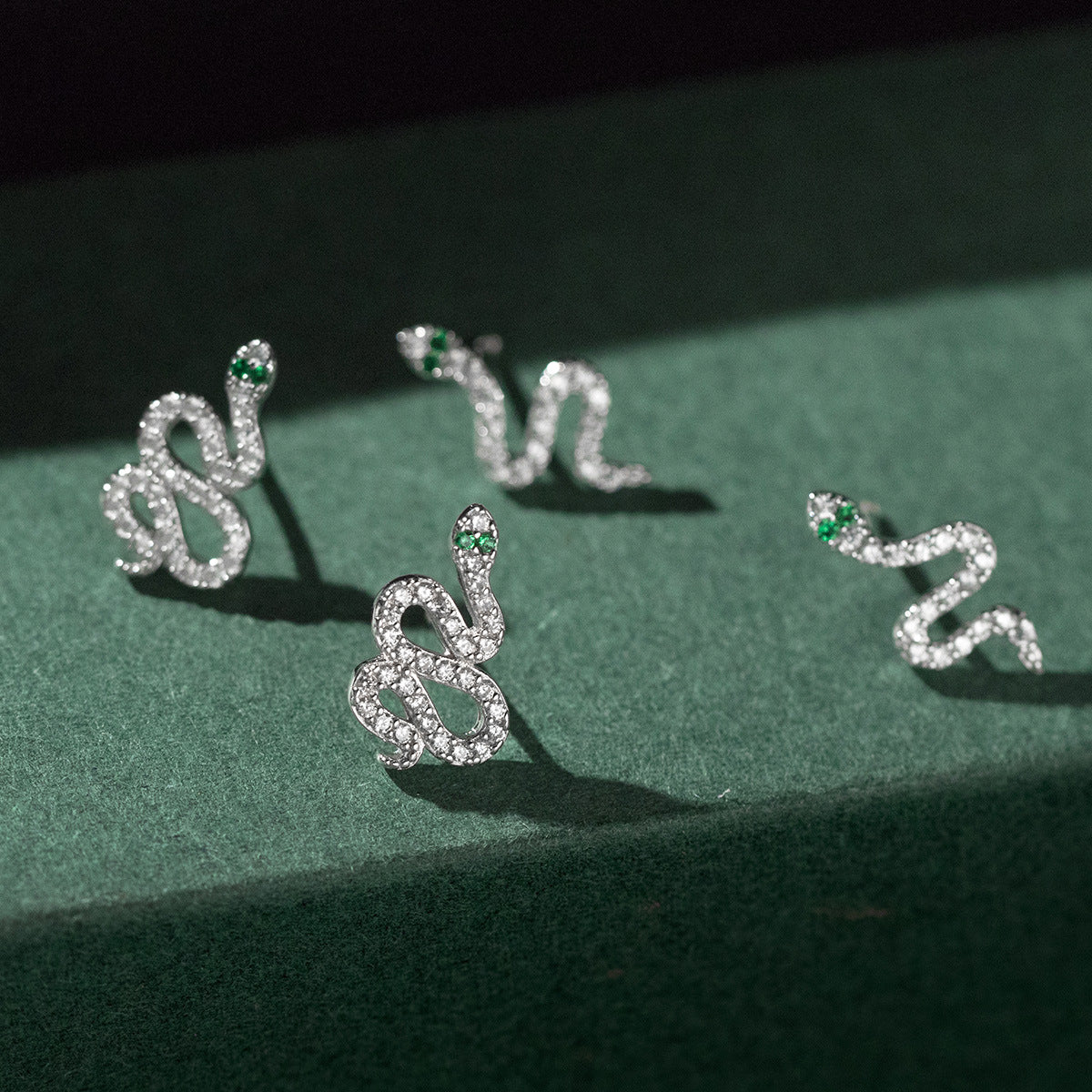 - Detailed view of the diamond-encrusted snake earrings highlighting the green gemstone eyes.