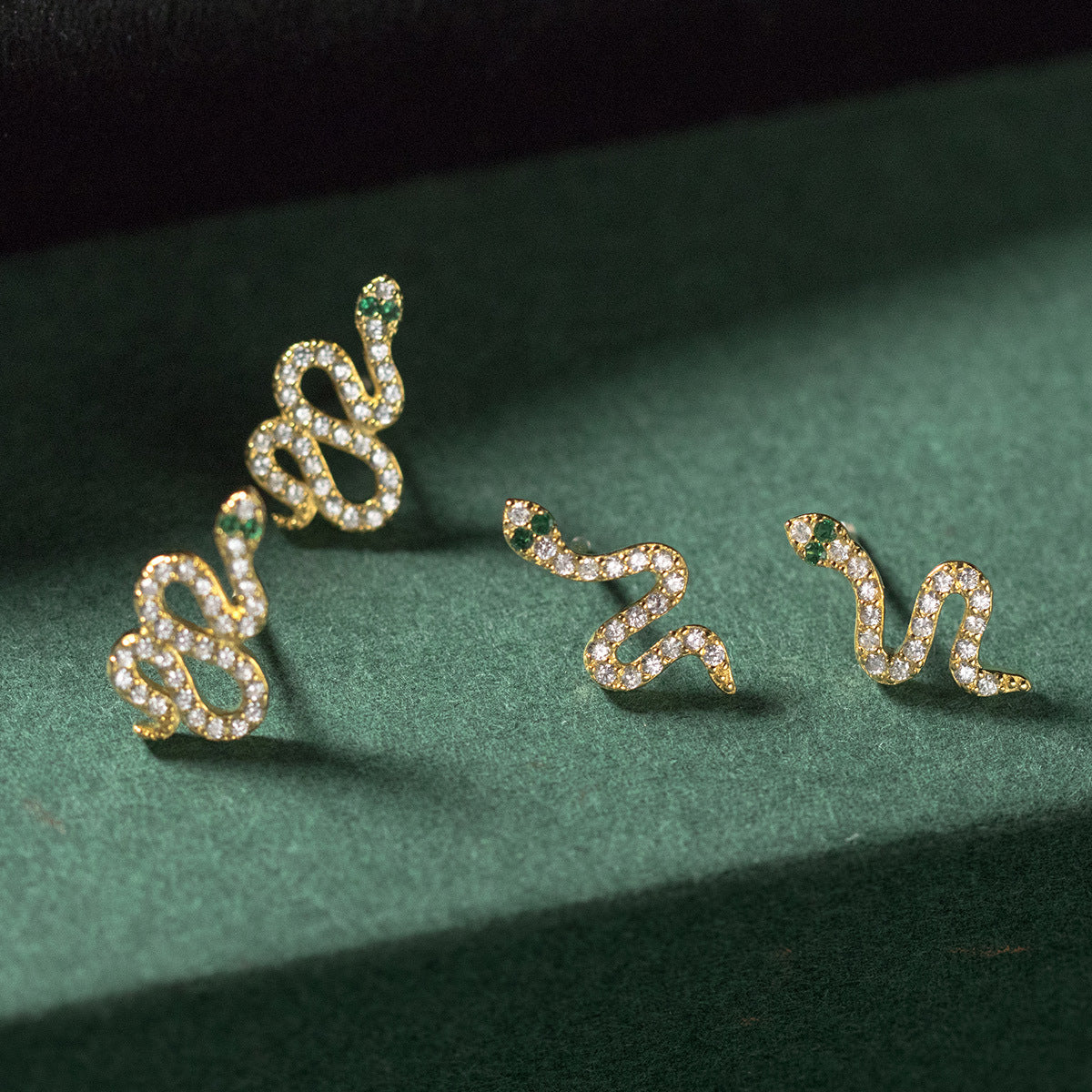 - A luxurious pair of gold snake earrings featuring diamond-like scales and emerald-like eyes.