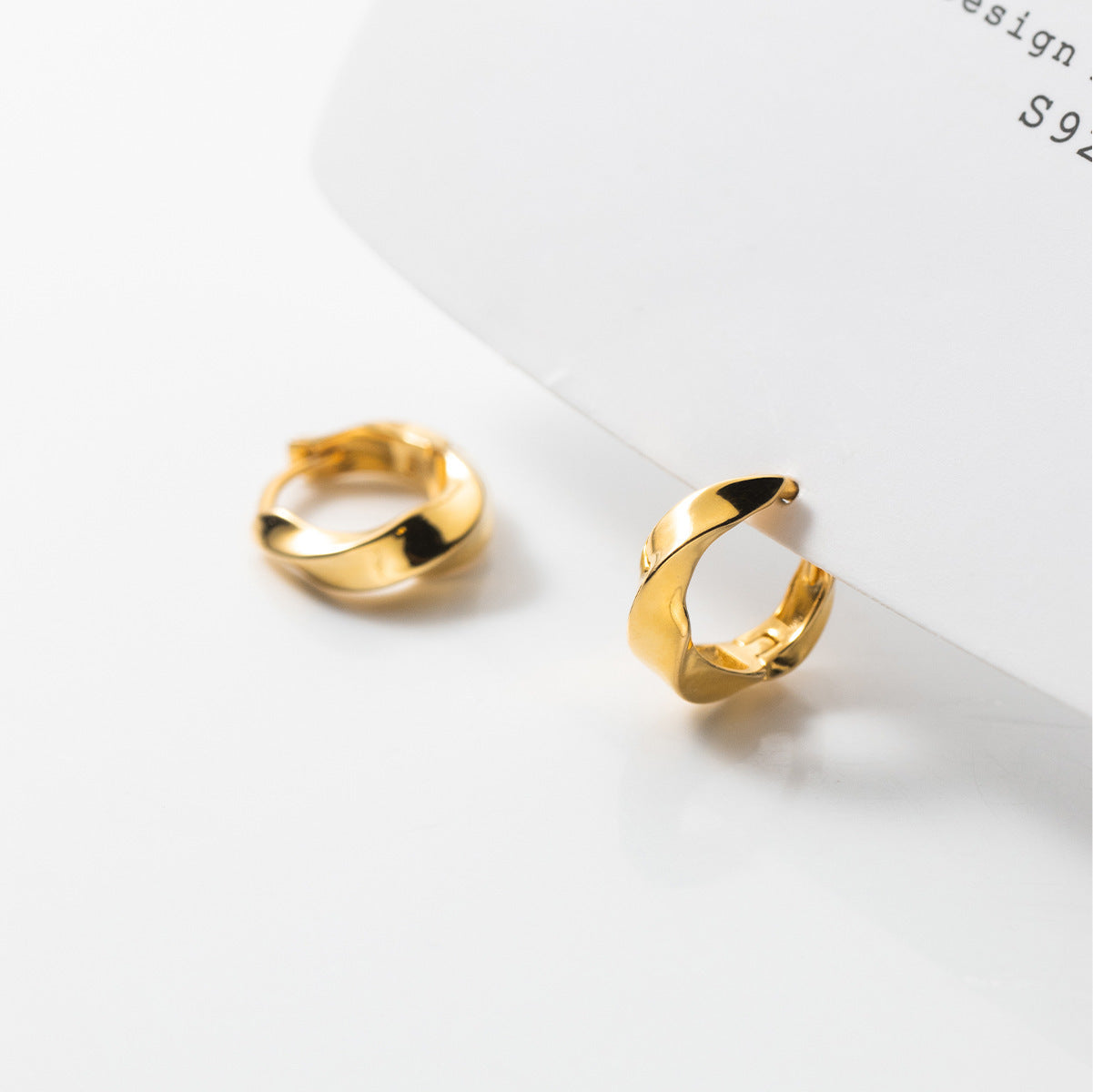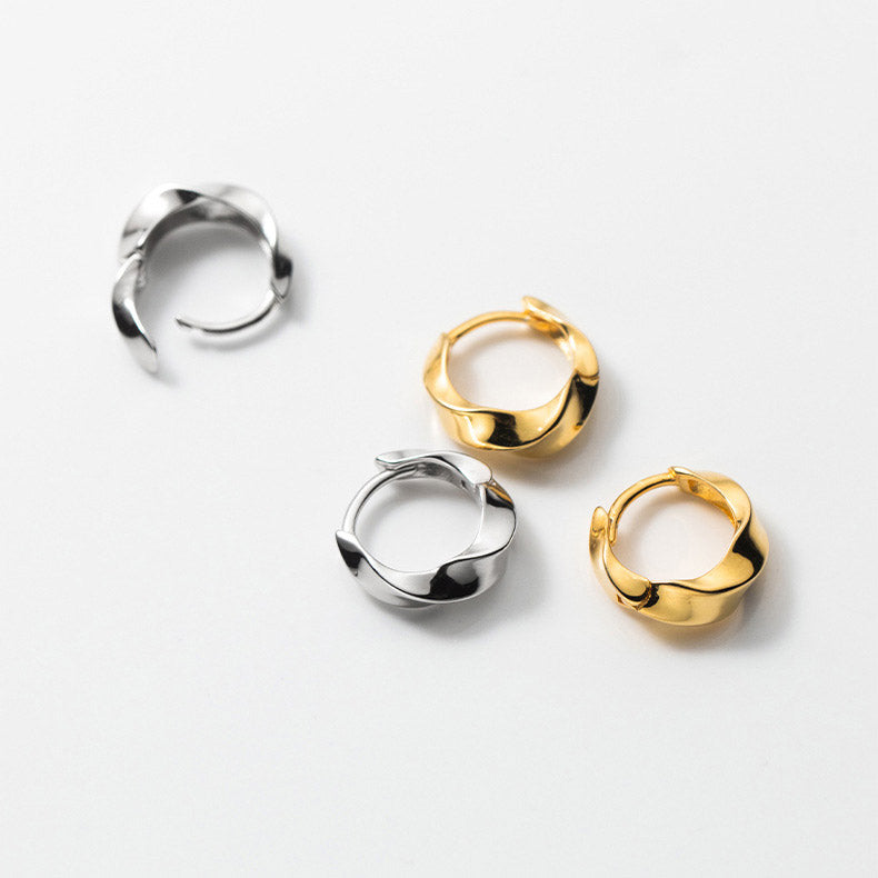 Both silver and gold versions of the Mobius twist hoop earrings displayed together.