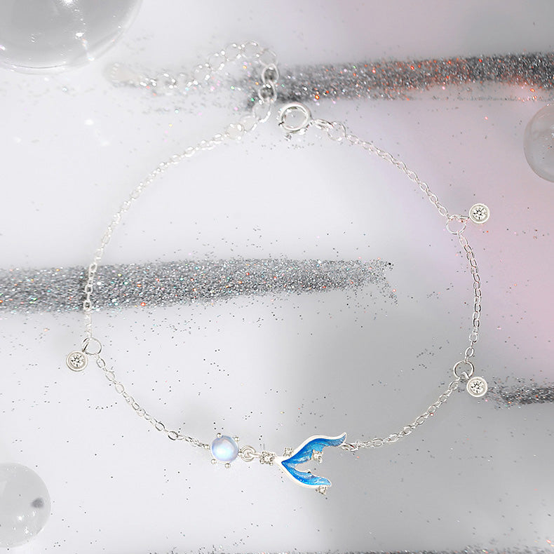 The centerpiece of each bracelet is a delicate mermaid tail charm, gracefully designed and complemented by a luminous moonstone that shimmers with every movement, reminiscent of sunlight dancing on ocean waves.