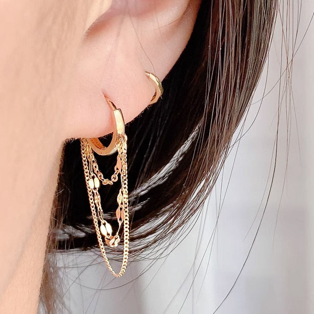 Close-up of the intricate multiple chain layers on the huggie earrings.