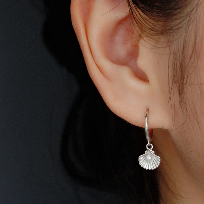 Each earring features a meticulously crafted shell pendant, complete with realistic texturing, that cradles a luminous, high-quality pearl. The huggie hoop design ensures a secure and comfortable fit, making them suitable for all-day wear.