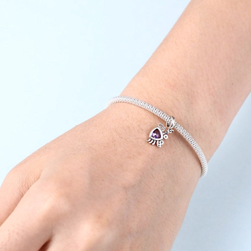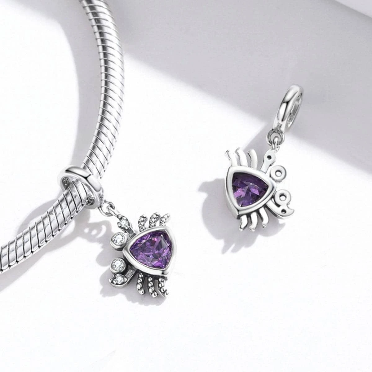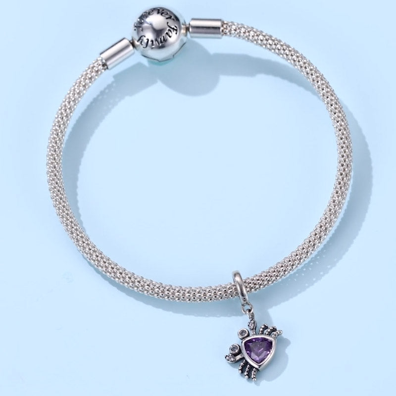 - A Pandora-style charm bracelet featuring the purple crab charm alongside other charms.