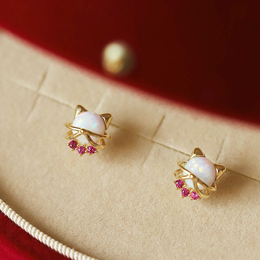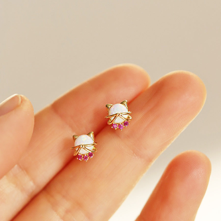 Charming 925 Sterling Silver Cat & Opal Studs