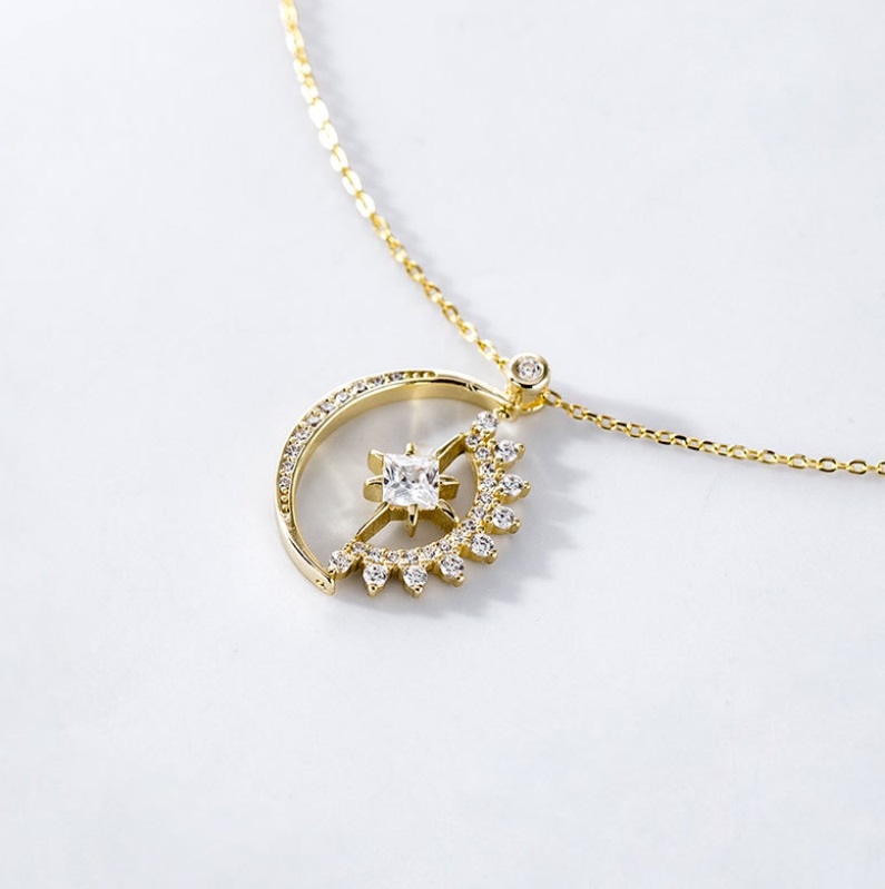 The 925 Sterling Silver Paved Moon Star Necklace shown in the luxurious gold-plated finish.