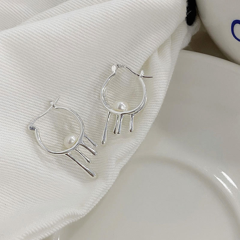 925 Sterling Silver Pearl Drop Liquid Hoop Earrings