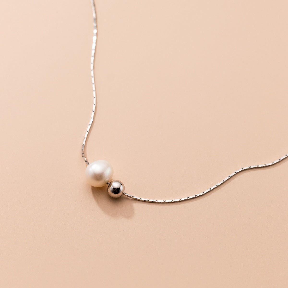 Detailed view of the pearl and silver bead on the 925 sterling silver necklace.