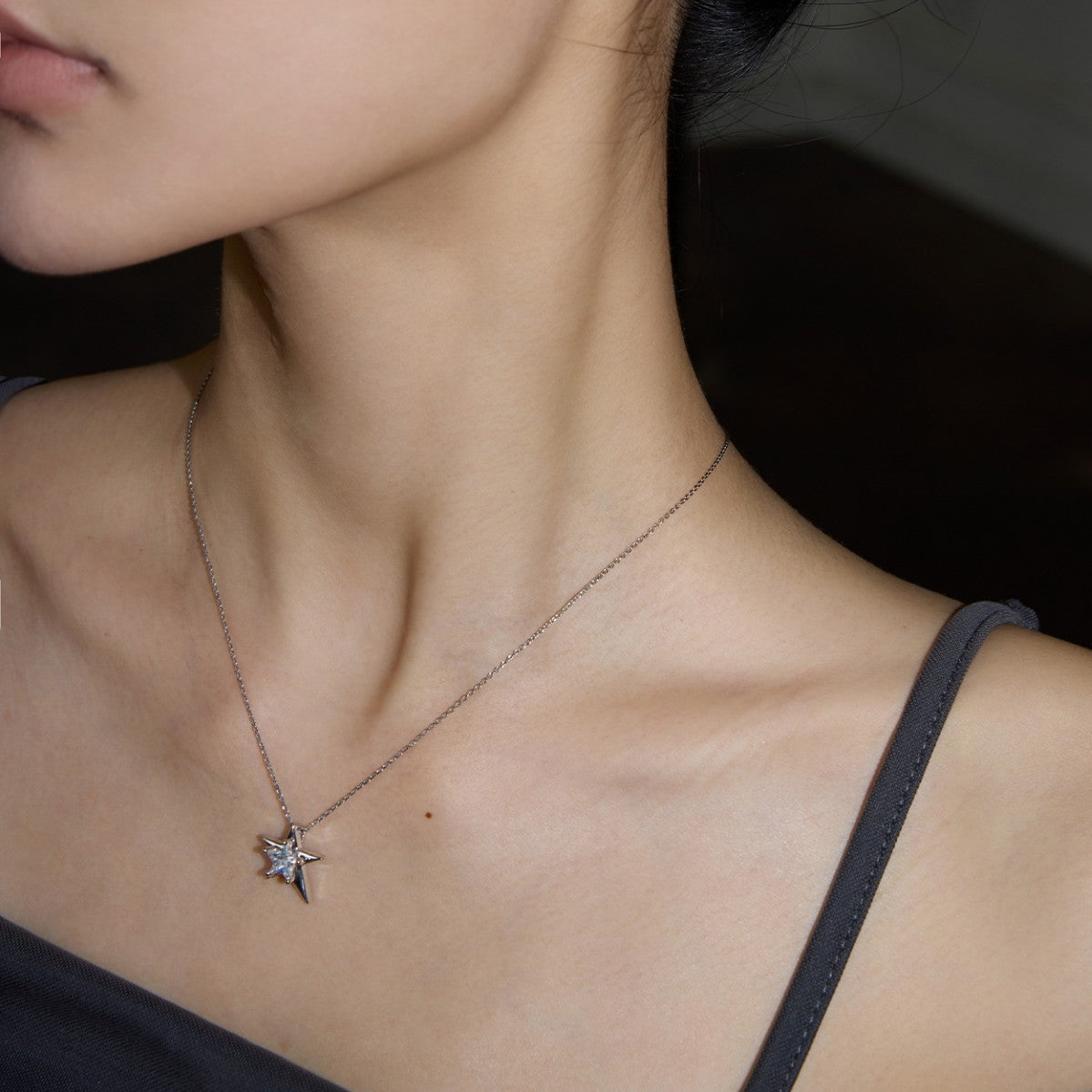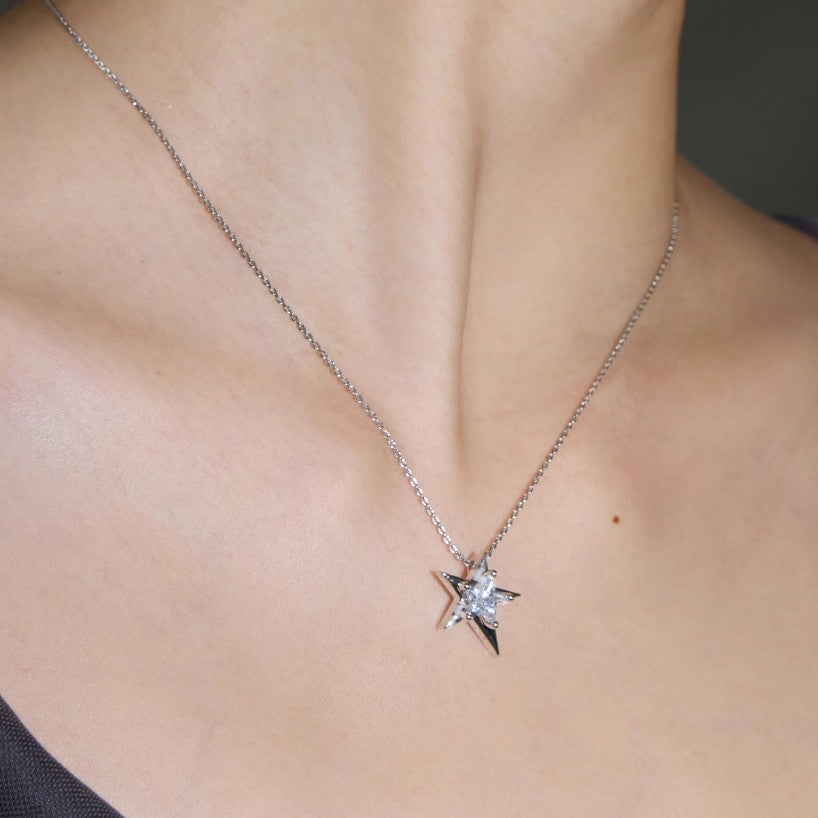 Discover celestial elegance with this necklace featuring a unique, irregular five-pointed star pendant. Crafted from genuine 925 sterling silver and plated with lustrous platinum, the pendant is accented with sparkling zircon stones for a touch of brilliance. The modern, asymmetrical design offers a chic and contemporary aesthetic, perfect for elevating any outfit from casual to formal.