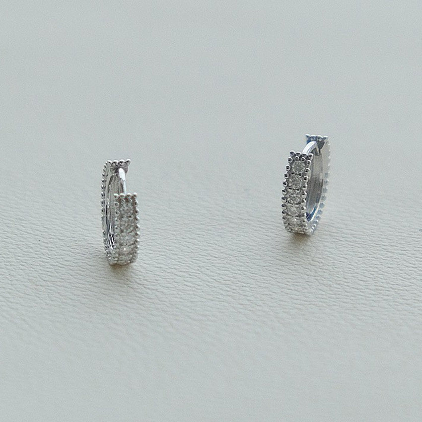 Detailed view of the 925 sterling silver huggie earrings highlighting the brilliant cubic zirconia stones.