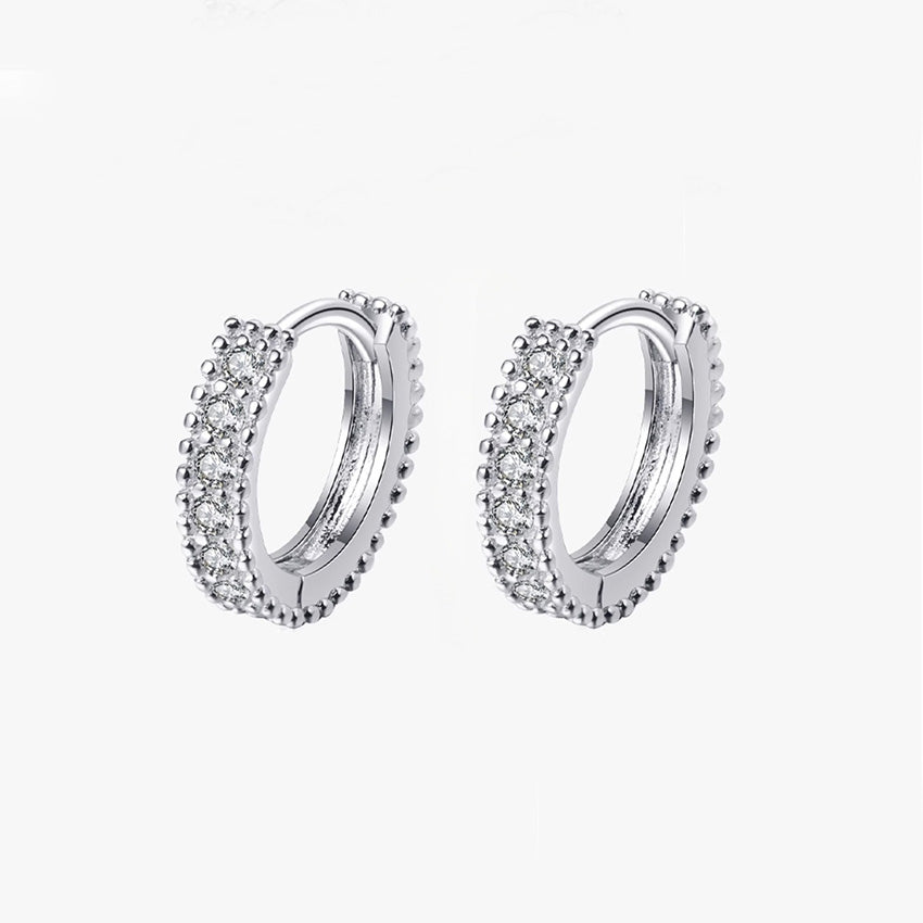 Elevate your style with our 925 Sterling Silver Huggie Earrings, exquisitely finished with a durable platinum plating for a cool, polished shine. Each earring is meticulously lined with a neat row of shimmering cubic zirconia stones, delivering the perfect amount of sparkle to enhance your daily look without being overwhelming. The refined pave setting ensures a consistent, radiant shimmer from every angle.