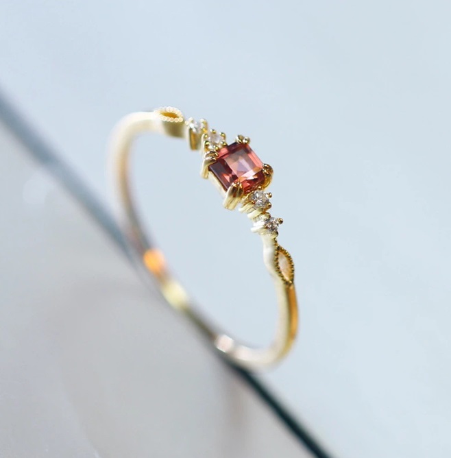 - Angled view of the gold-plated sterling silver ring, displaying the elegant setting of the pinkish-red gemstone.