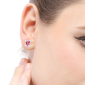 Detailed view of the red and white enamel flower stud earrings in sterling silver.