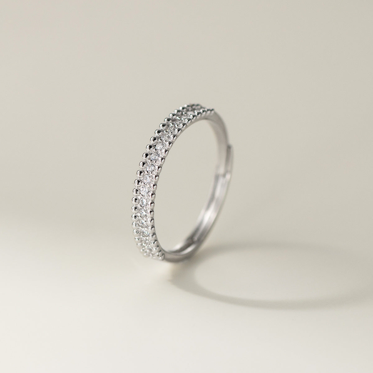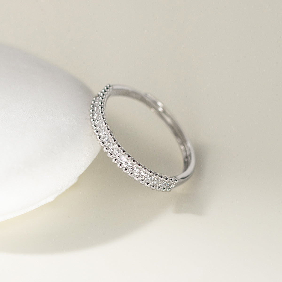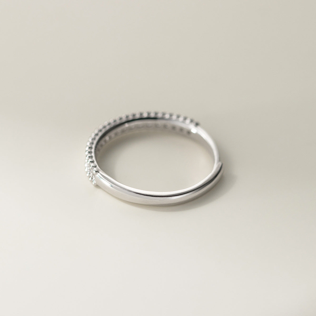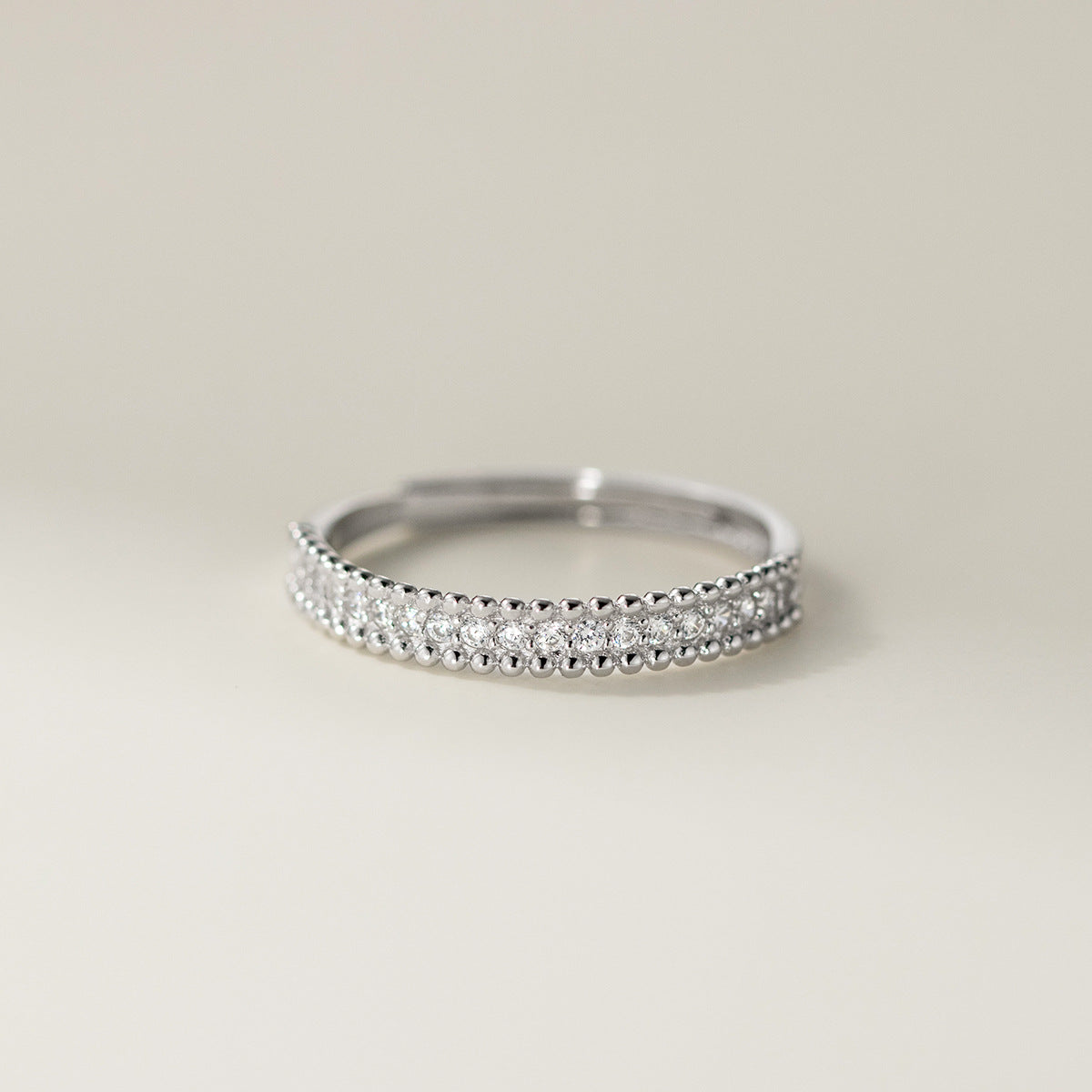 - Close-up of a 925 sterling silver ring with a double row of beaded cubic zirconia, highlighting its minimalist style.