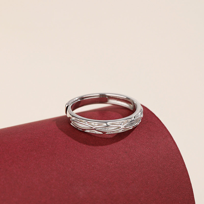 - Close-up of the adjustable sterling silver promise ring with a unique design.