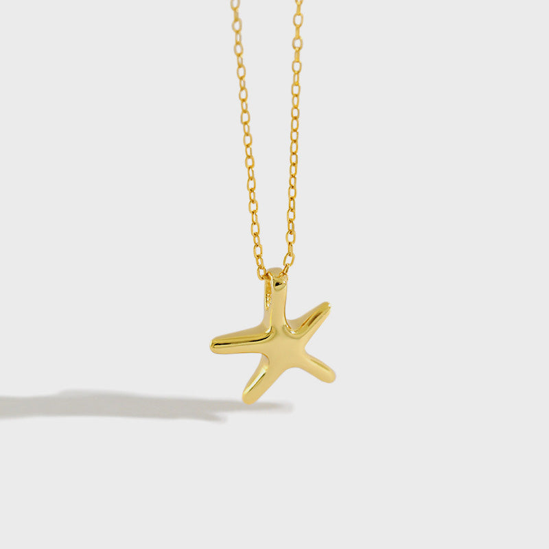 Detailed view of the gold starfish pendant on its delicate chain.
