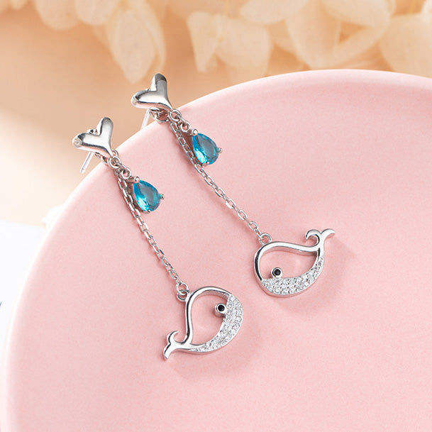 - Product: 925 Sterling Silver Sea Blue Stone Whale Chain Drop Earrings