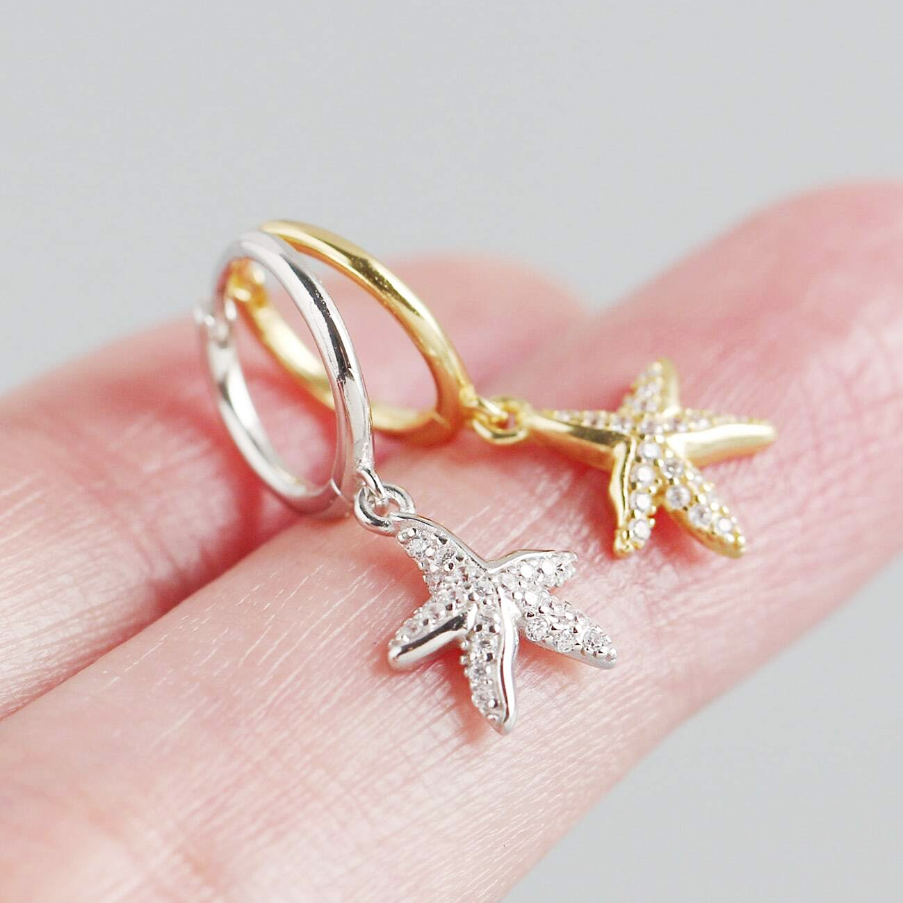 Close-up detail of the gold and silver starfish earrings, highlighting the clear stone embellishments.