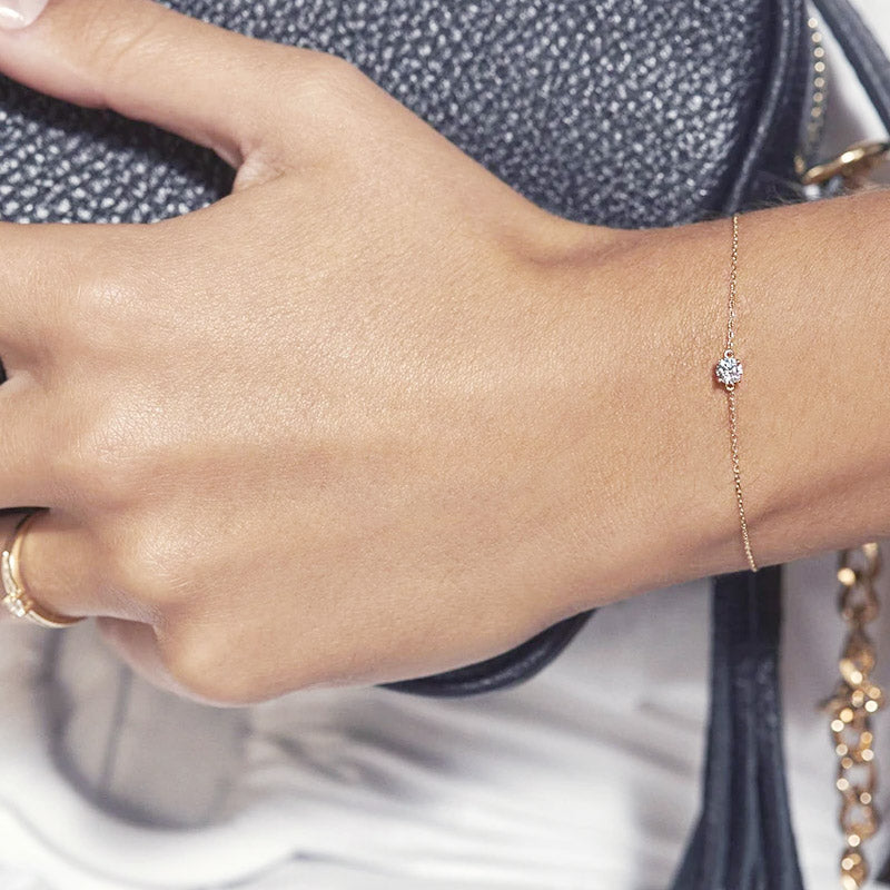 - Model wearing the gold single cubic zirconia thin chain bracelet, showing its delicate design on the wrist.