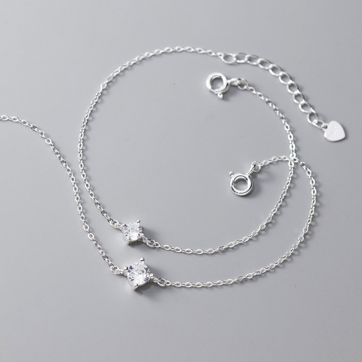 - Two sterling silver single zircon bracelets shown side-by-side to compare the different stone sizes.