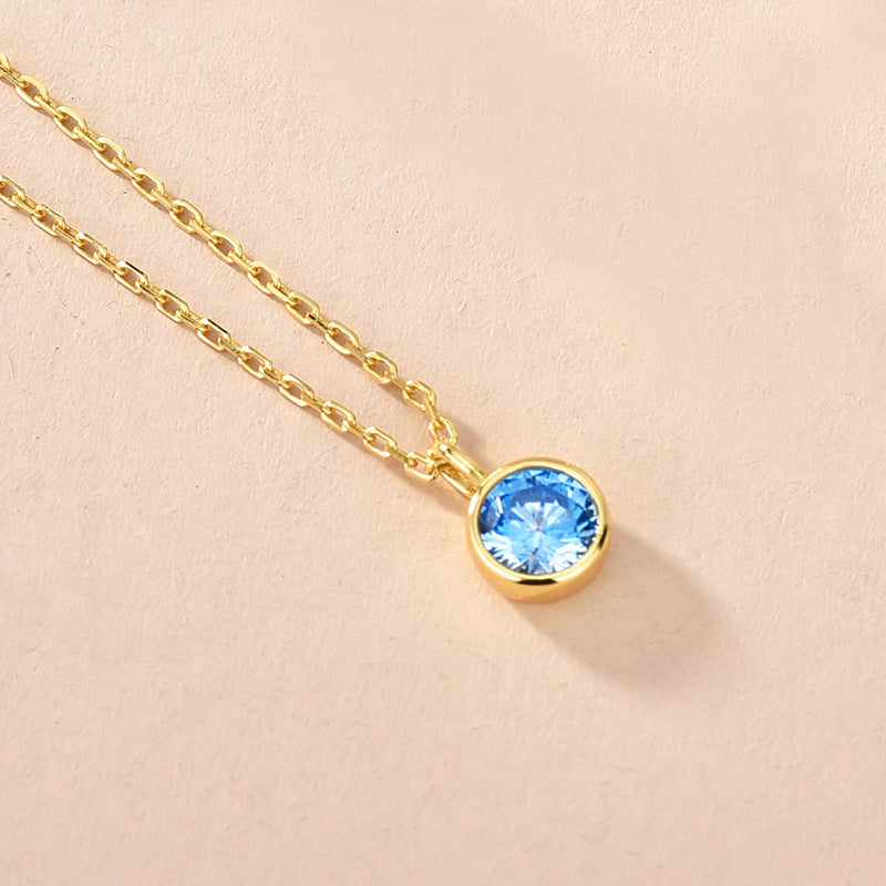 A stunning zodiac birthstone necklace in gold with a deep blue zircon stone.