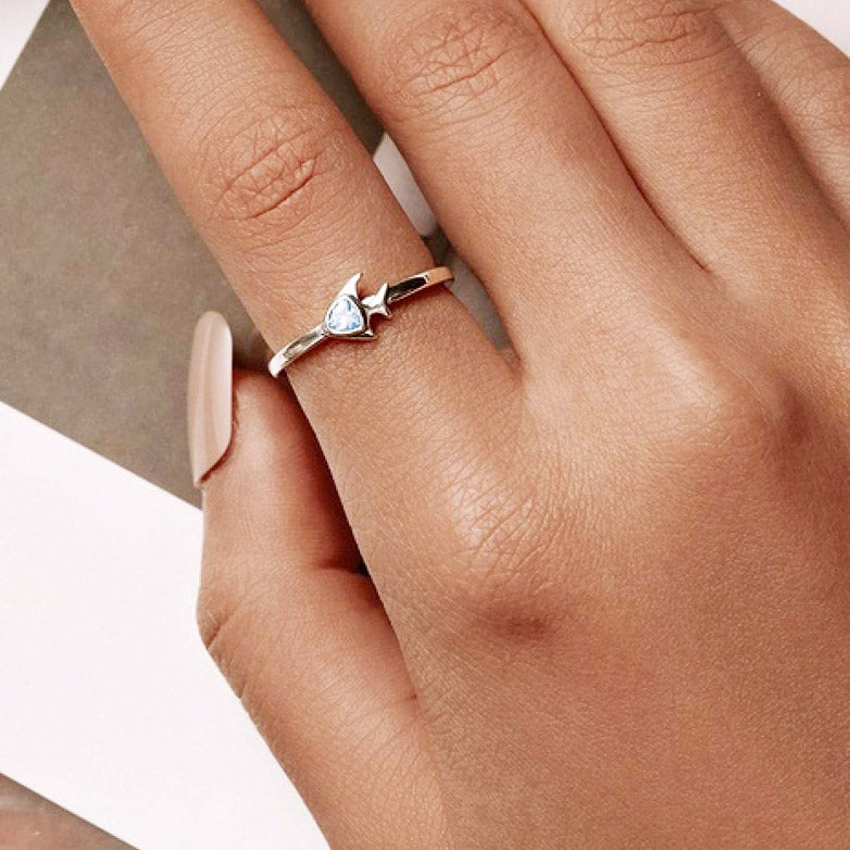 - A sterling silver ring from the set featuring a delicate star design with a central gemstone.